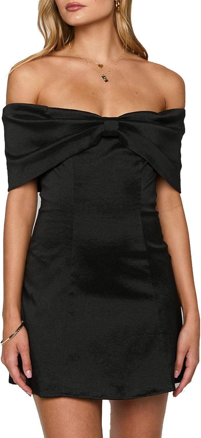 Women's Elegant Satin Off Shoulder Bow Front Mini Dress Stretchy Fitted Bodycon Party Club Cocktail Dress