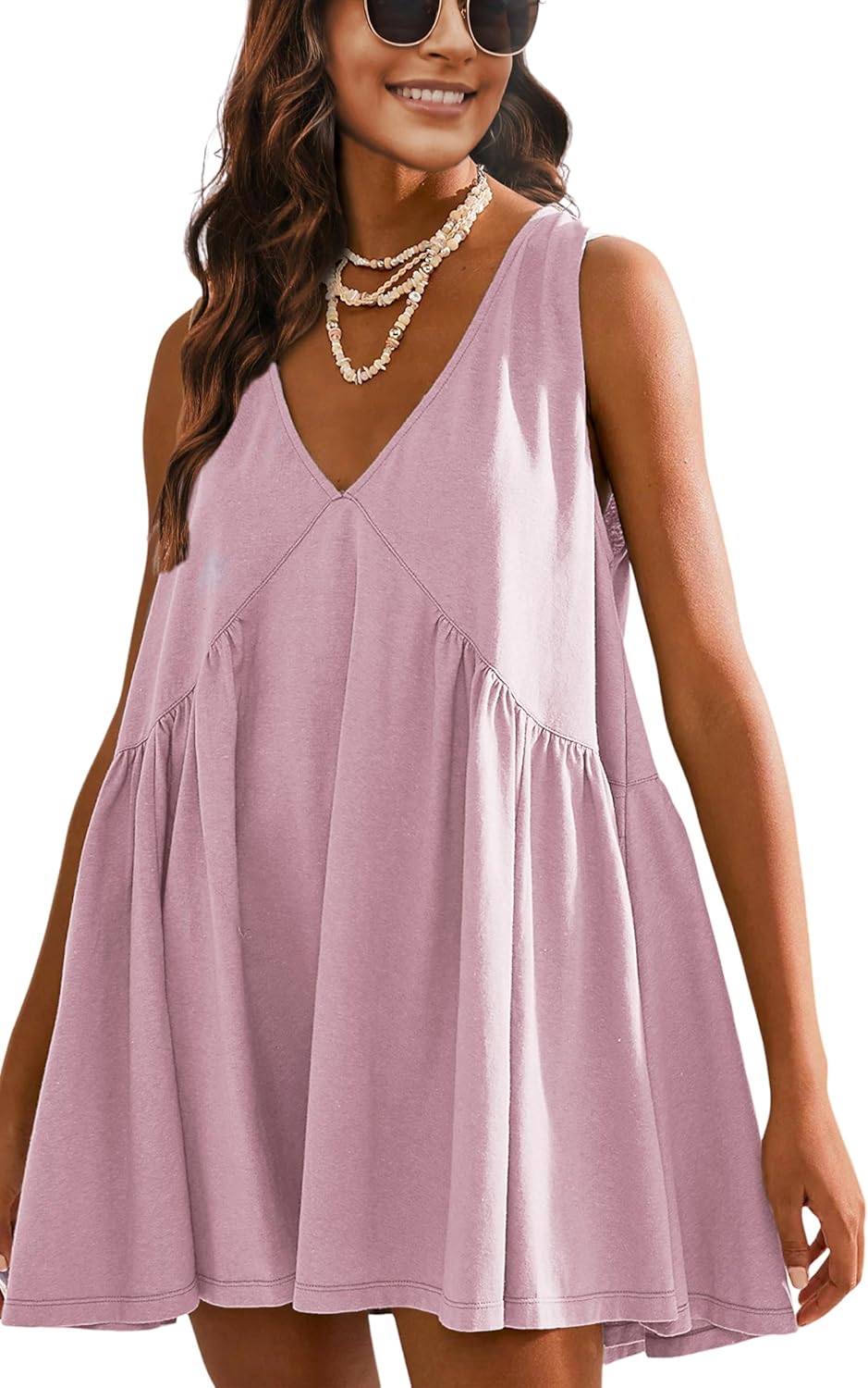 Athlisan Womens Summer Sleeveless Mini Dress Loose V Neck Sundress with Pockets(Pink-M), Medium