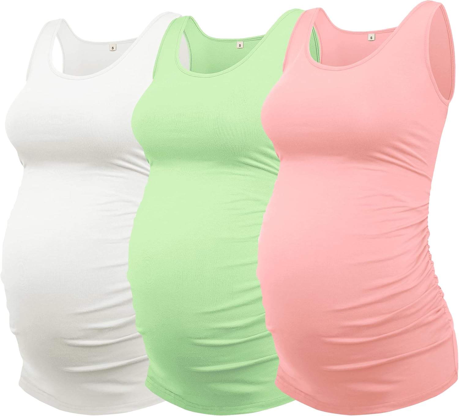 Ecavus 3PCS Womens Layering Maternity Tank Top Pregnancy Shirt Scoop Neck Sleeveless Ruched Vest