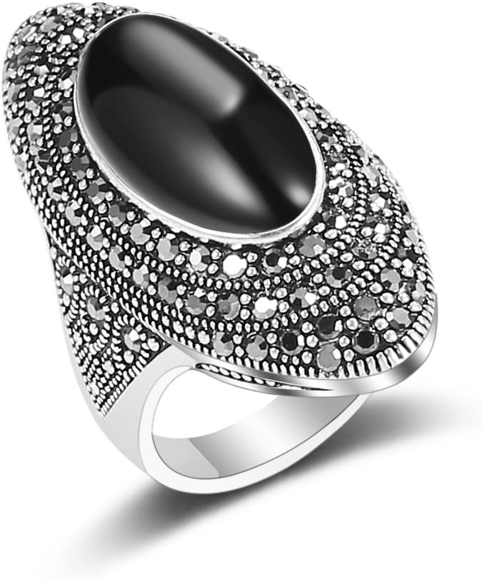 Mytys Retro Vintage Cocktail Statement Ring Black Marcasite & Crystal Rings for Women Antique Silver Big Black Onyx Stone Ring