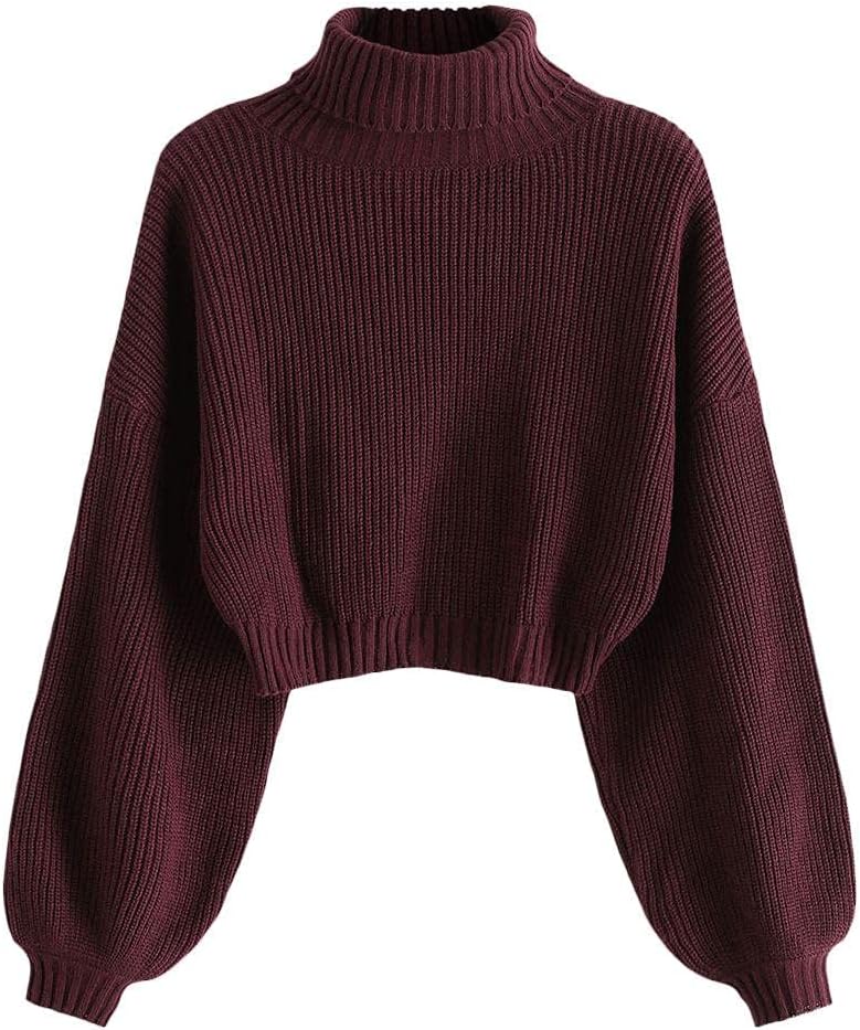 ZAFUL Women's Crew Neck Long Sleeve Pullover Crop Sweater Mock Neck Lantern Sleeve Ribbed Knit Cropped Sweater