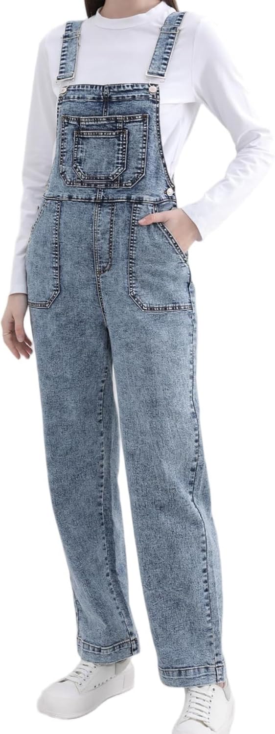 Women's Denim Overalls with Adjustable Straps Relaxed Fit Multiple Pockets Vintage Wash Stretchy Jean Overalls