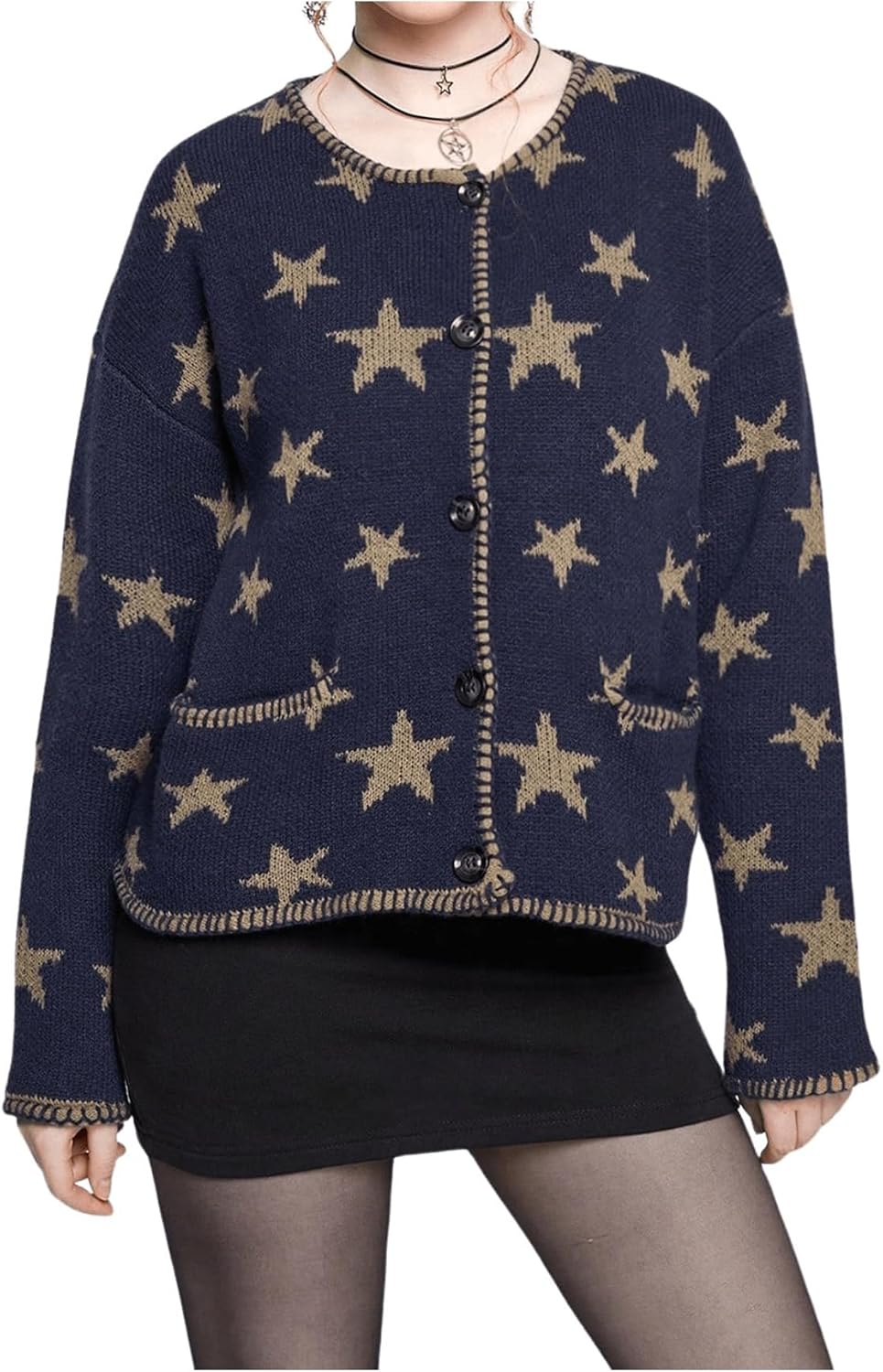 Women's Star Sweater Cardigan Goth Grunge Button Up Chunky Oversized Cardigan with Pockets Vintage 70s Outfits
