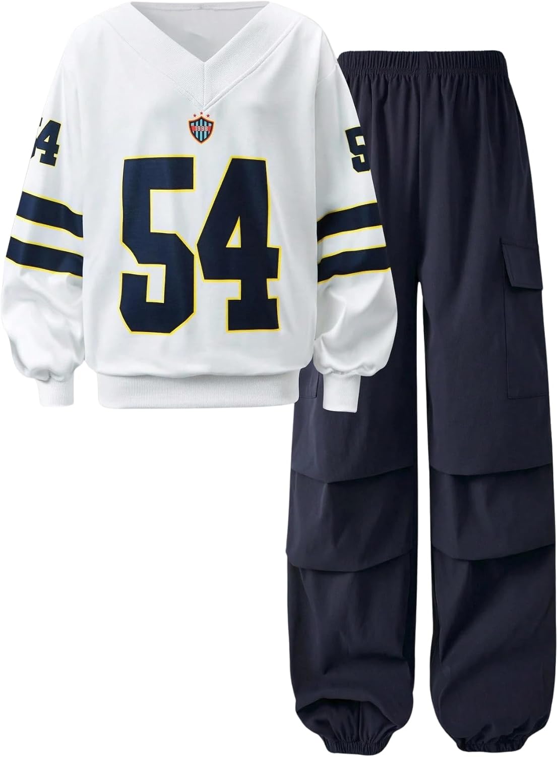 Tween Girls Clothes Sporty Color Blocking Numeral Print Sweatshirt & Cargo Pants Outfit Set
