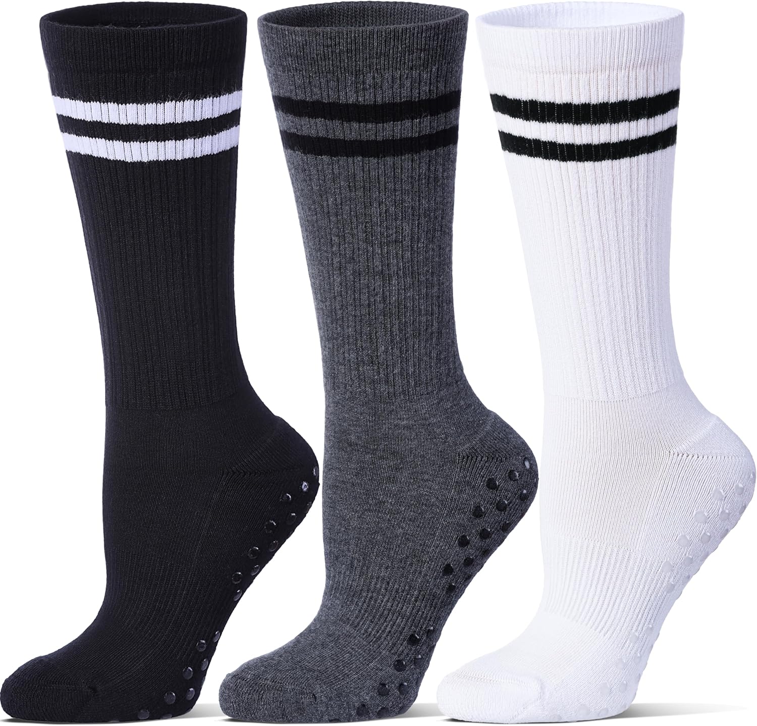 Pilates Grip Socks for Women,Striped Yoga Non Slip Cushioned Long Socks for Barre, Dance, Workout 3 Pairs