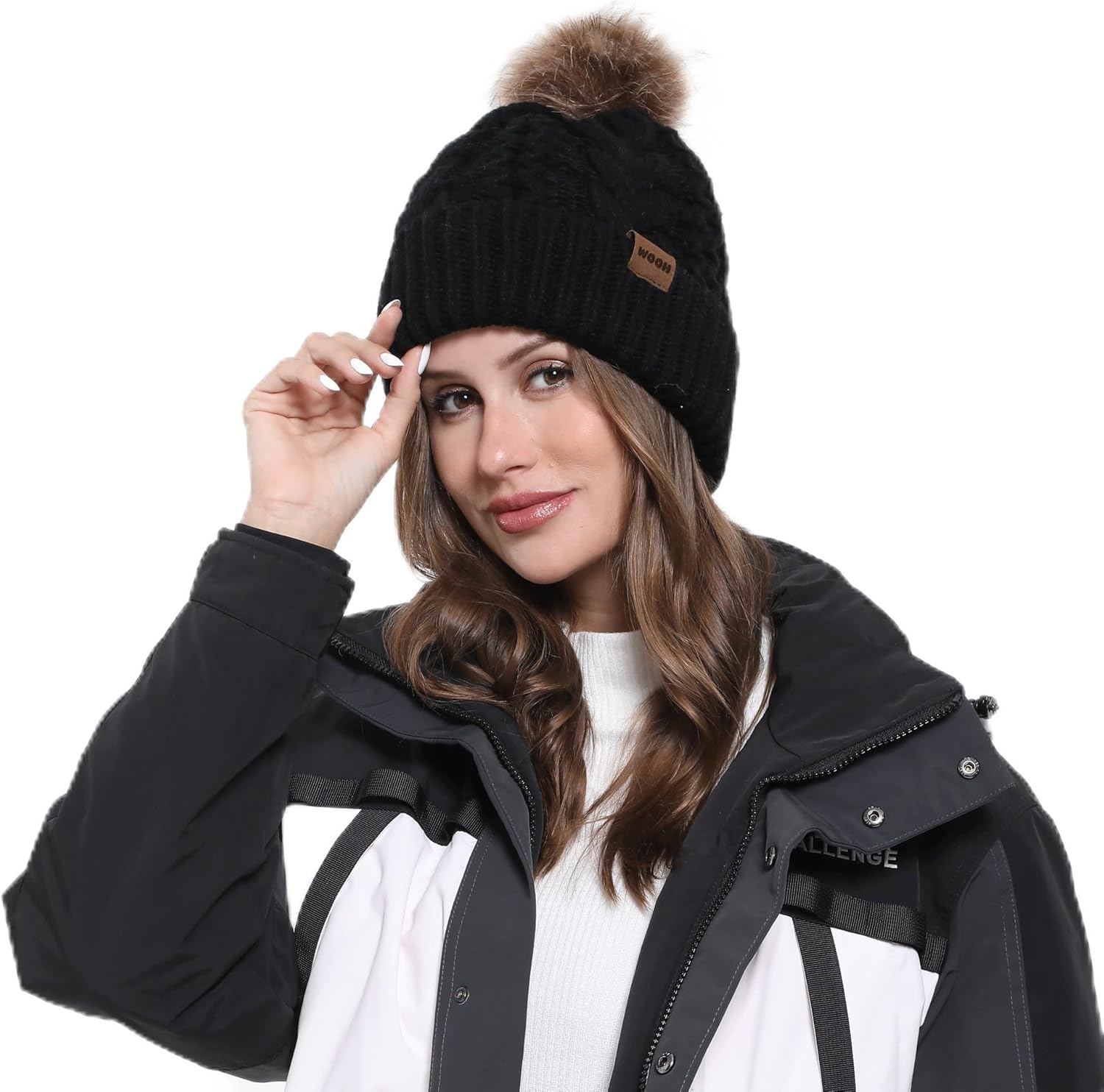 WOOH Womens Beanies for Winter,Knit Hat with Faux Fur Pom Pom Beanie for Women,Warm Fleece Lined,Less Static