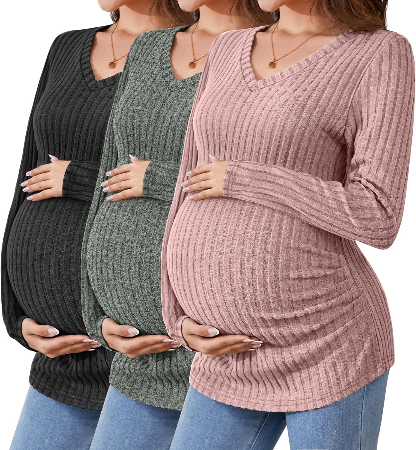 Ficerd 3 Pack Women's Maternity Shirts Ribbed Long Sleeve Pregnancy Tops V Neck Knit Side Ruched Pregnant Clothes Sweater