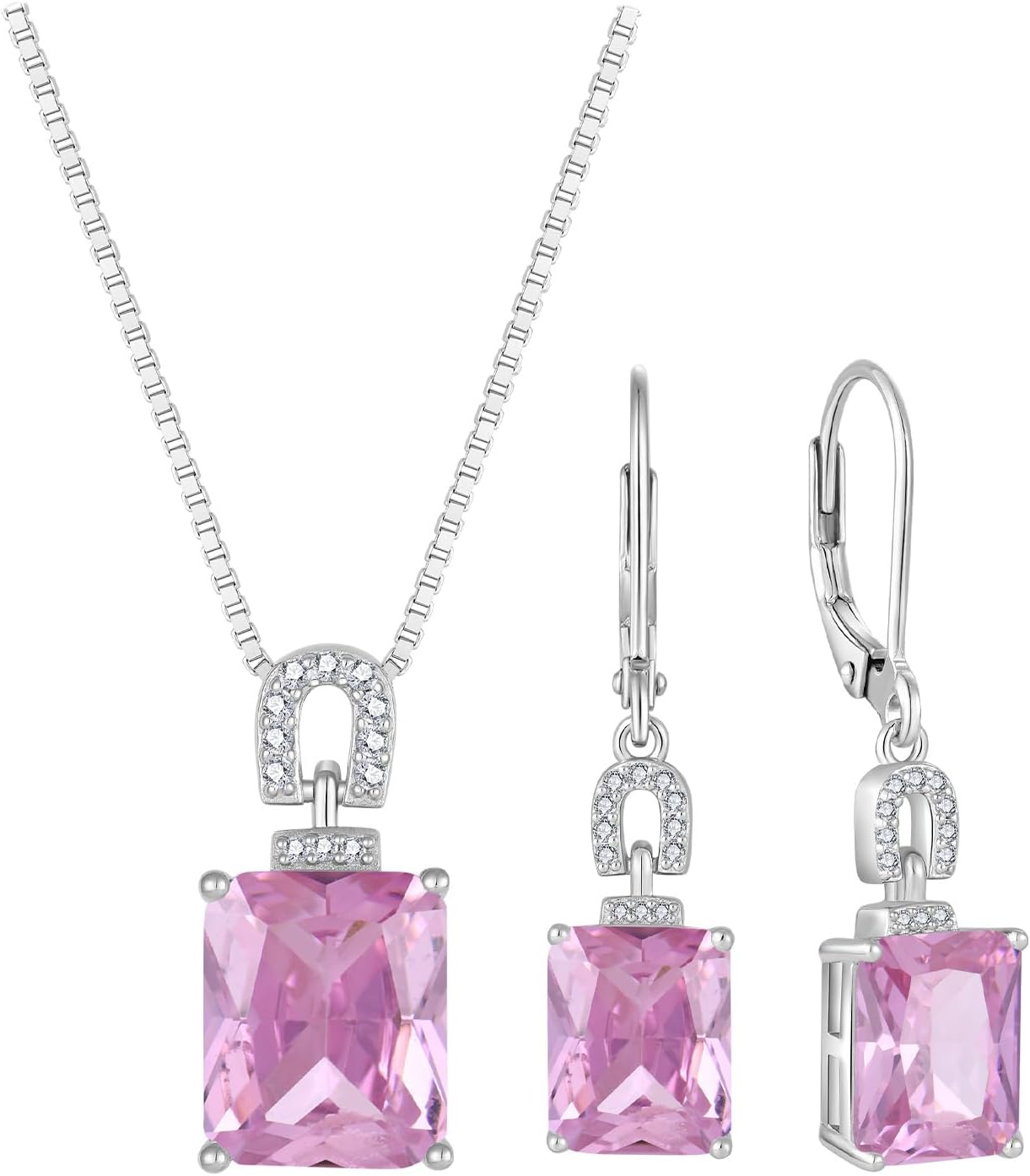 Emerald Cut Necklace Earrings Set 925 Sterling Silver Pink Tourmaline Jewelry Set October Birthstone Jewelry Gifts for Women