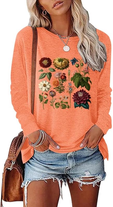 Womens Fall Cute Graphic Long Sleeve Tops Crew Neck Printed Nature Tshirts Tops