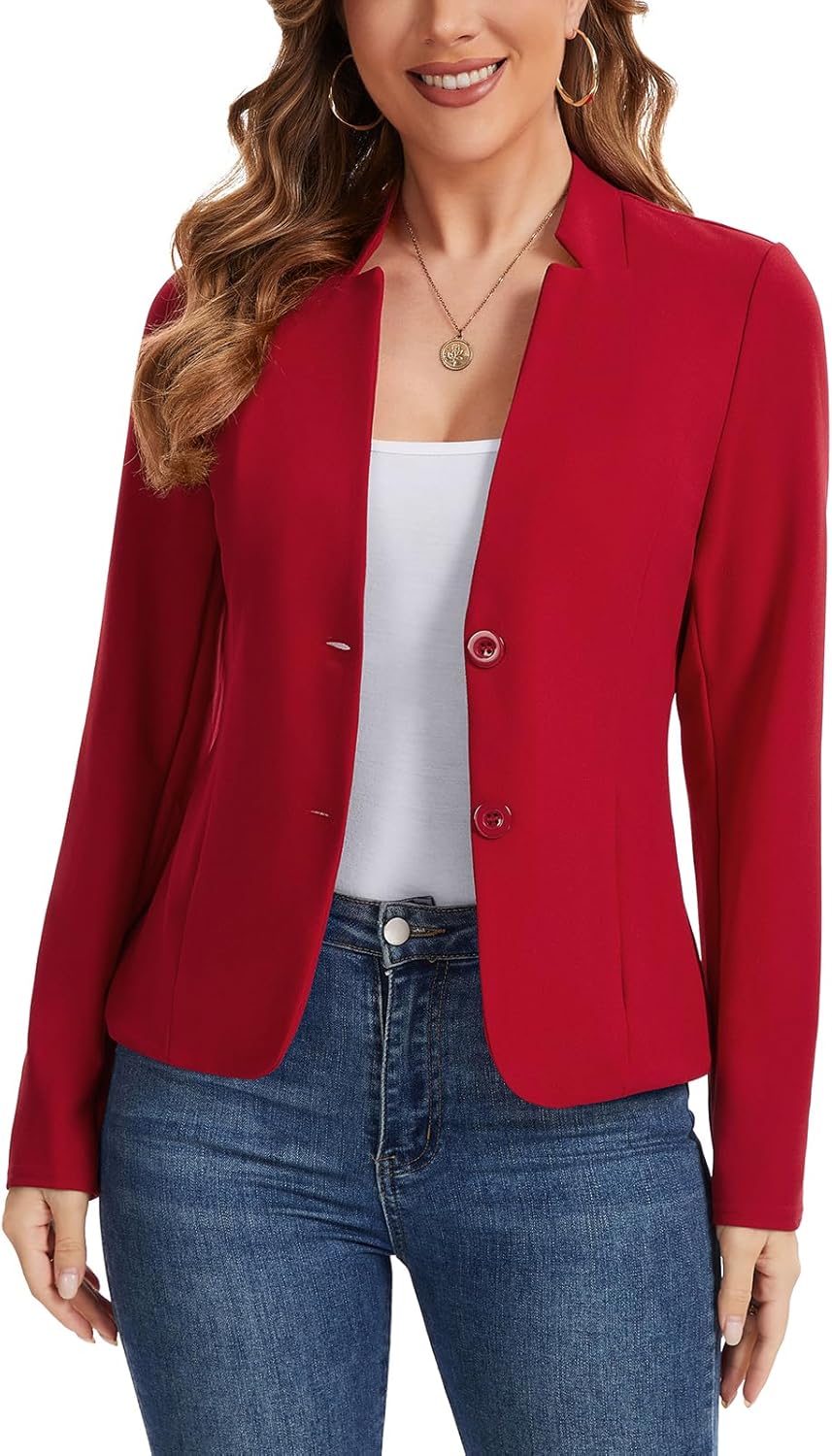 Womens Casual Blazers Two Button Suit Notched Collar Jacket Work Office Long Sleeve Blazer with Pockets,M,Red
