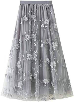 CosSky Womens Foral Tulle Skirt Elastic High Wasit Embroidery Floral Mesh Tutu A-Line Midi Skirts