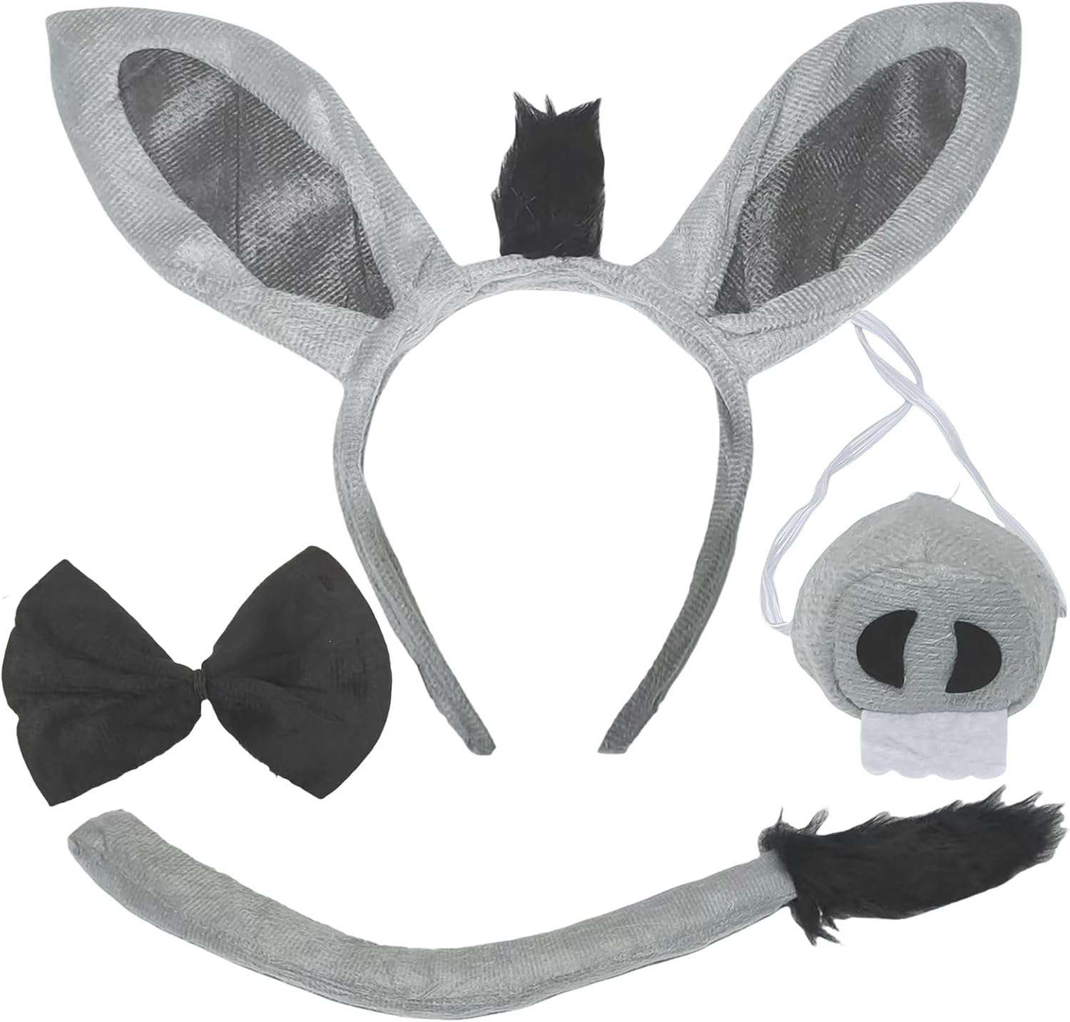 4-Piece Donkey Costume Accessory Set - Donkey Ears Headband, Bow Tie, Tail, and Nose Mask for Halloween, Dress-Up Parties, Cosplay, and Animal-Themed Party Supplies for Adults Kids