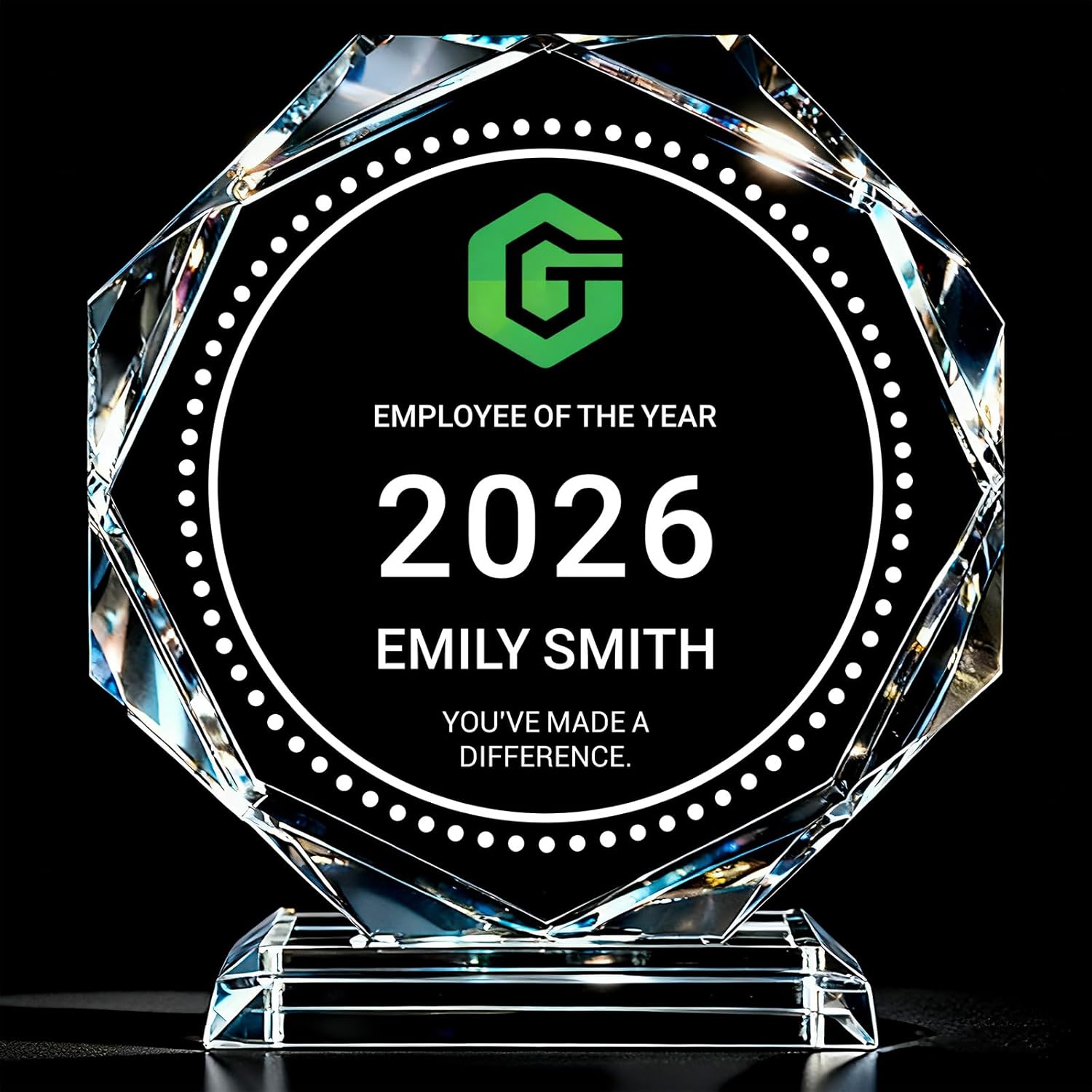 - 🧩 Material & Finish Options: Create a meaningful recognition moment with a fully customizable trophy in two materials—Acrylic or Crystal—so you can match the look to your event. Acrylic supports UV printed text & logo only (no engraving). Crystal supports UV printing (text & logo) or engraved text (logo not engraved). Great for employee recognition, corporate appreciation, retirement/farewell, school awards, sports teams, volunteer thanks, and milestones. Photo-ready display.
