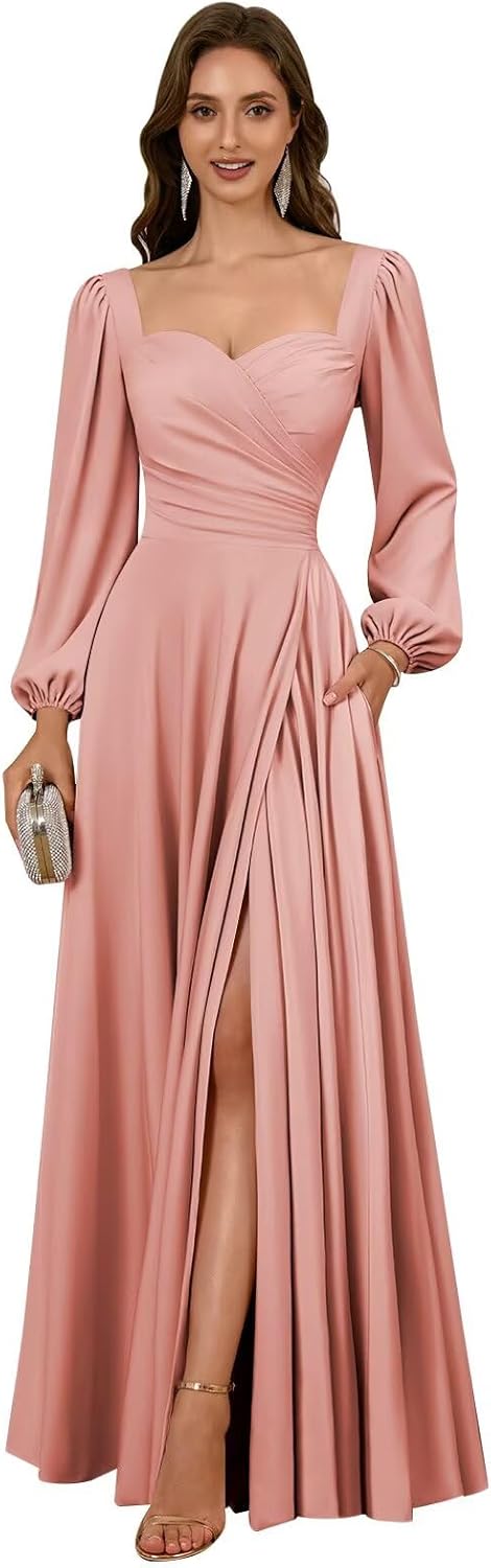 Long Sleeve Bridesmaid Dresses for Women Satin Pleated Formal Dress A Line Evening Party Gown with Slit