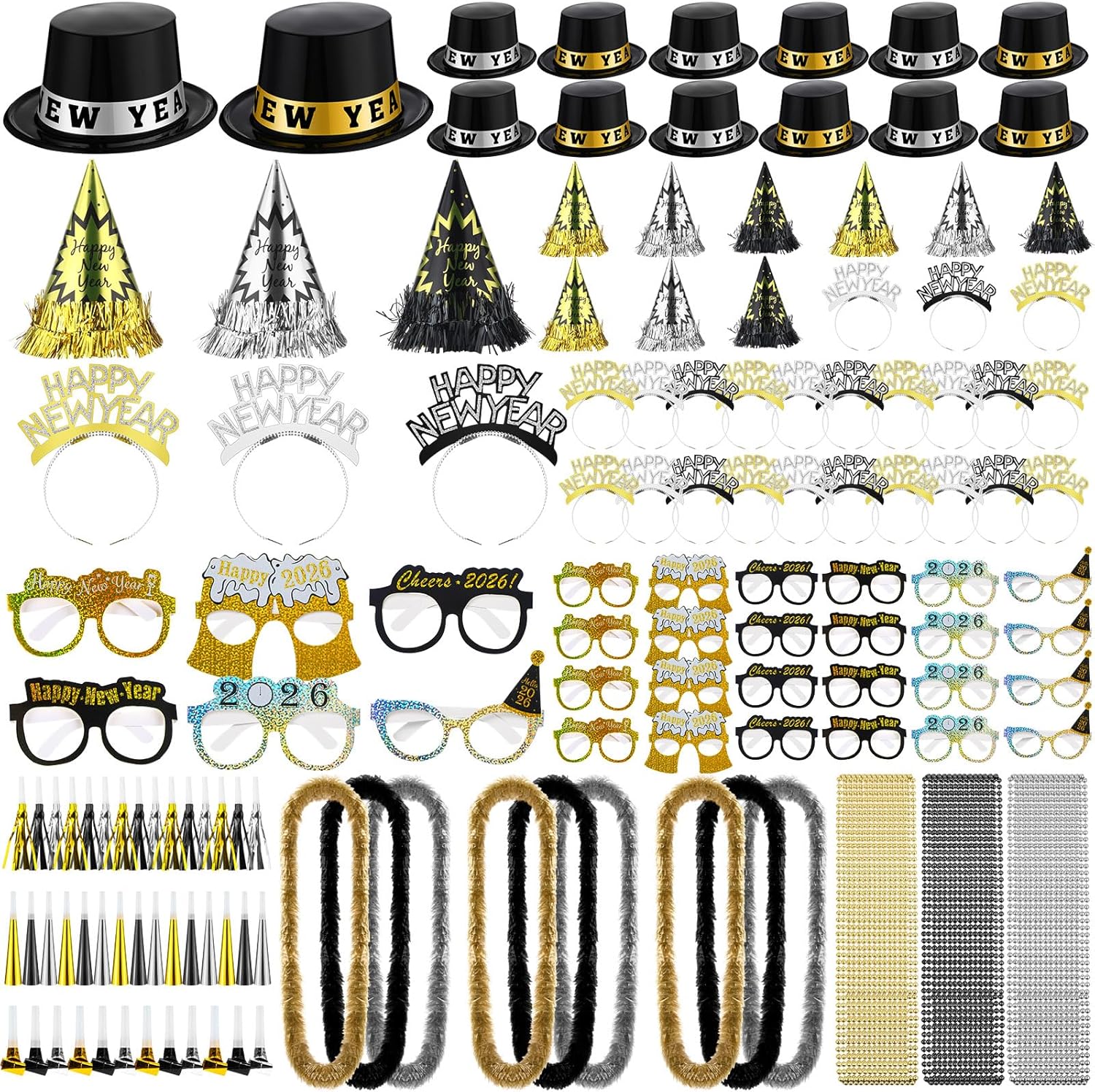 - New Years Eve Party Set: you will get 204 pieces of 2026 New Year's Eve party supplies, including 14 Happy New Year top hats, 54 paper glasses, 12 Happy New Year cone hats, 24 tiara headbands, 25 beaded necklaces and 25 leis necklaces, 15 squawkers and 15 blowouts, 20 paper horns, adequate party supplies will meet your party supplies needs