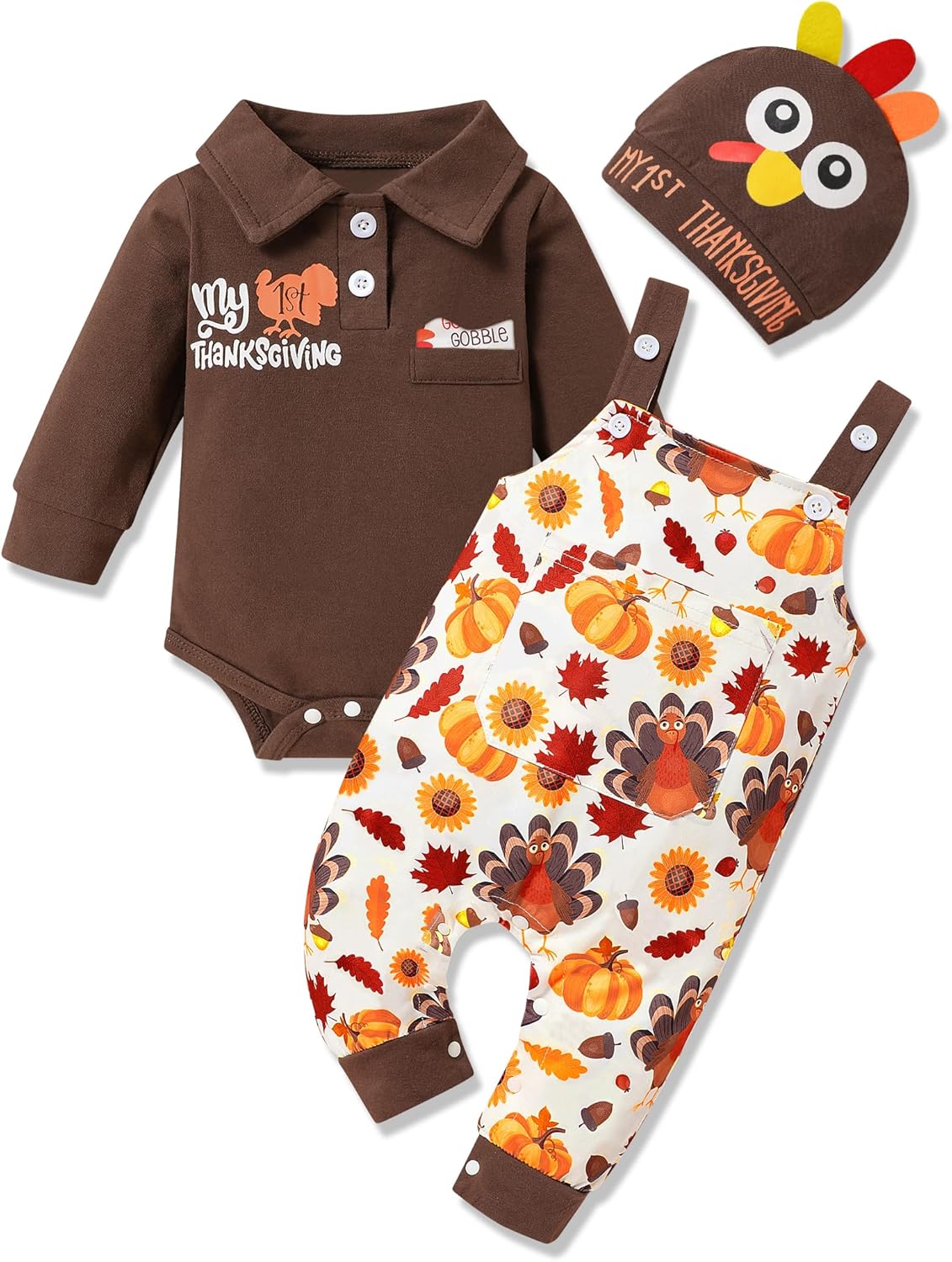 Thanksgiving Baby Boy Outfit My First Thanksgiving Print Romper 3PCs Outfits