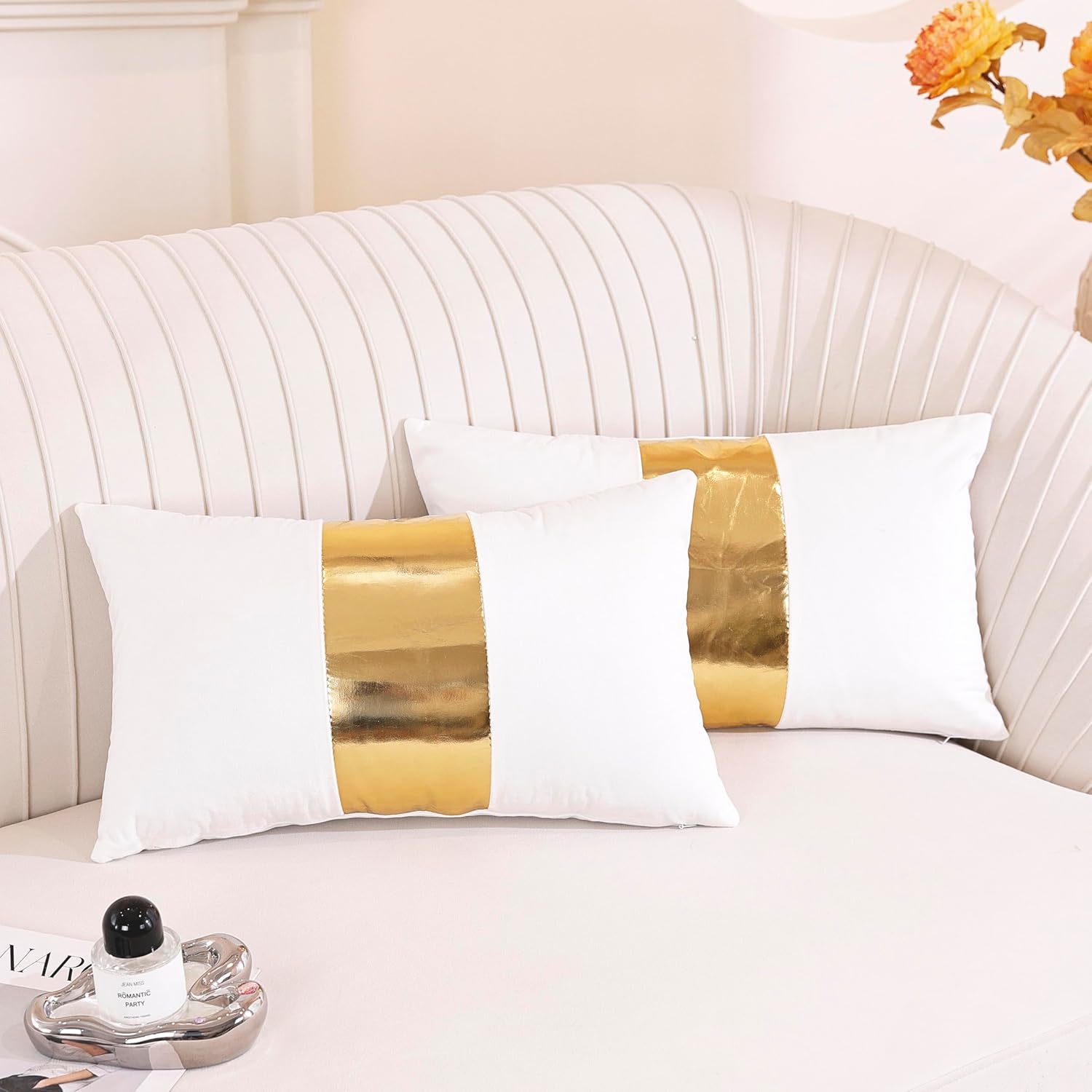 TAOSON Pack of 2 Velvet Decorative Throw Pillow Covers White Patchwork with Gold Striped Leather Pillow Covers 12 × 20 Inch Cushion Covers Decor Living Room Sofa Bedroom Car Only Cover No Insert