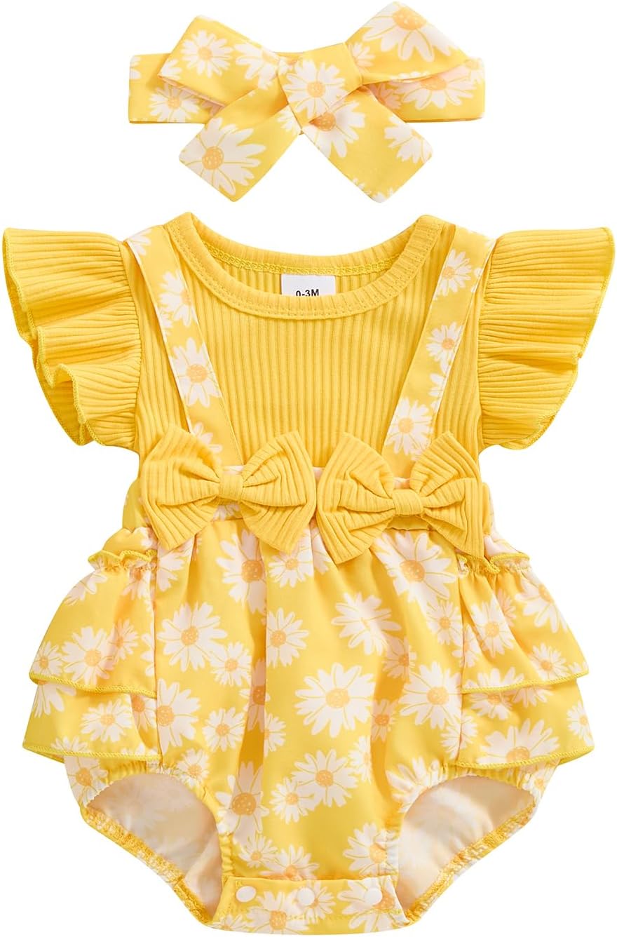 Newborn Baby Girl Outfit Fly Sleeve Floral Romper Dress Headband Infant Cute Summer Clothes Set