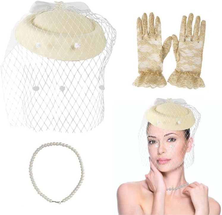 Women's Fascinators Veil and Retro Charming Mesh Hat with Lace Gloves Imitation Pearl Necklace,Suitable for 1920s or 1950s Vintage Tea Party Cocktail Hall Wedding Church Derby Hat Set. Beige