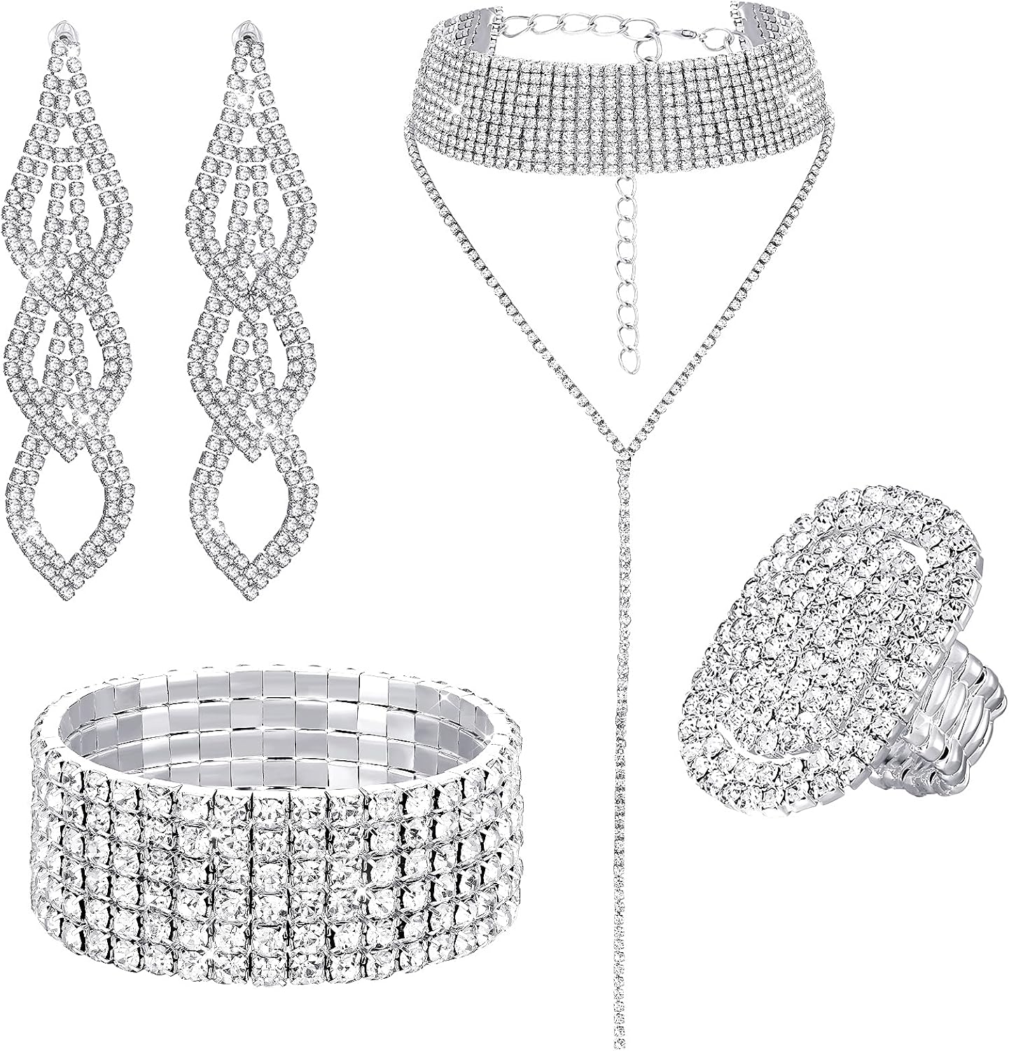 Fumete 4 Pcs Rhinestone Jewelry Set Bling Diamond Choker Necklace Bracelet Ring Earrings Set for Women Party Costume Jewelry