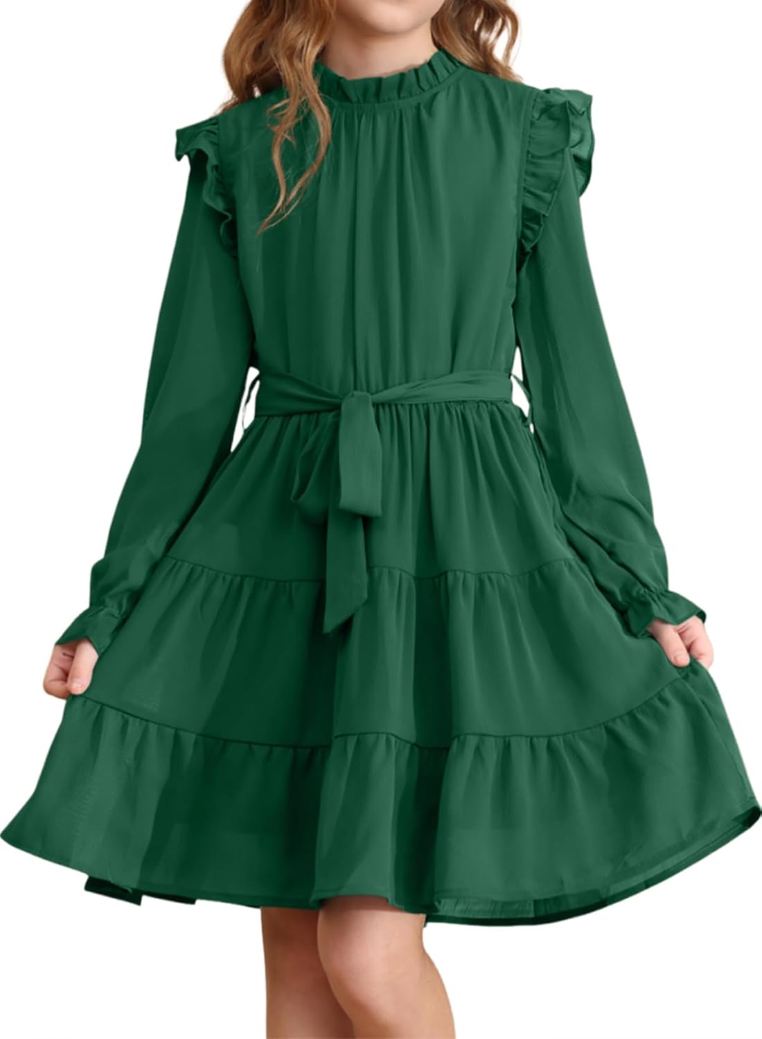 blibean Girls Long Sleeve Fall Dresses Tween Casual Ruffled Swing Formal Dressses Belt Size 4-15 Years