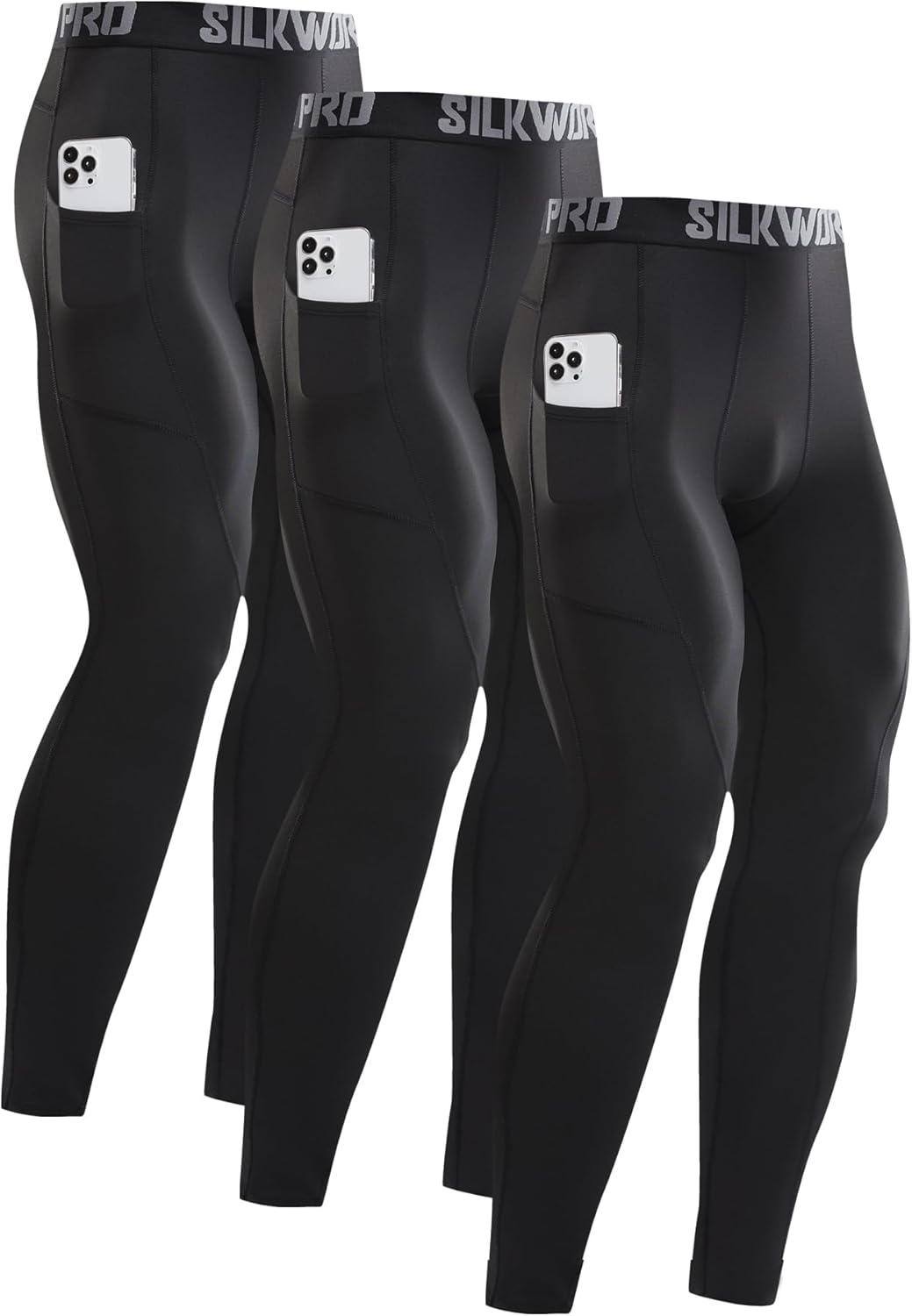 SILKWORLD Men's 1~3 Pack Compression Pants Pockets Cool Dry Gym Leggings Baselayer Running Tights