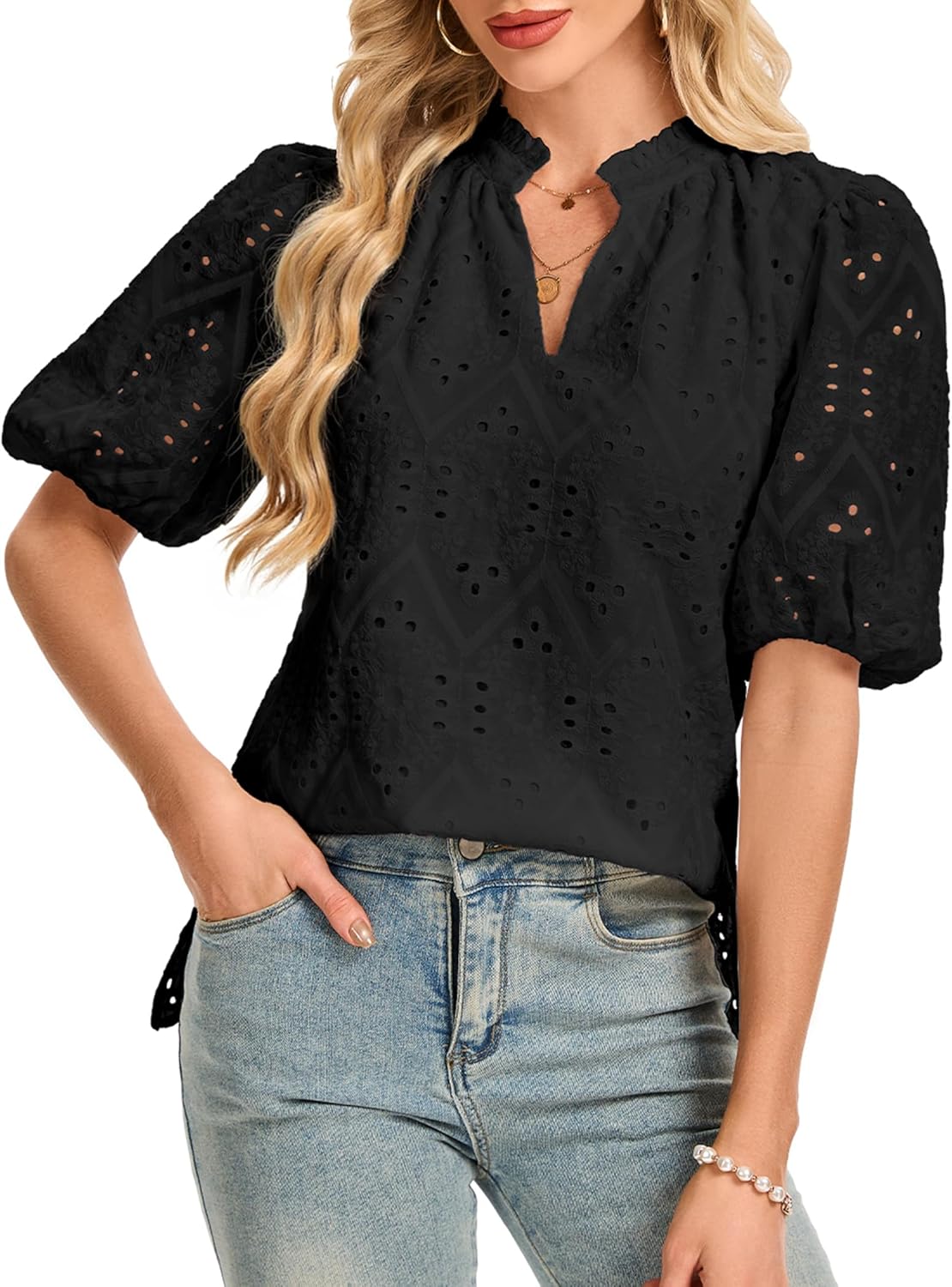 Women's V Neck Blouses Dressy Casual Puff Short Sleeve Shirts Hollow Summer Tops Business Women S-XXL