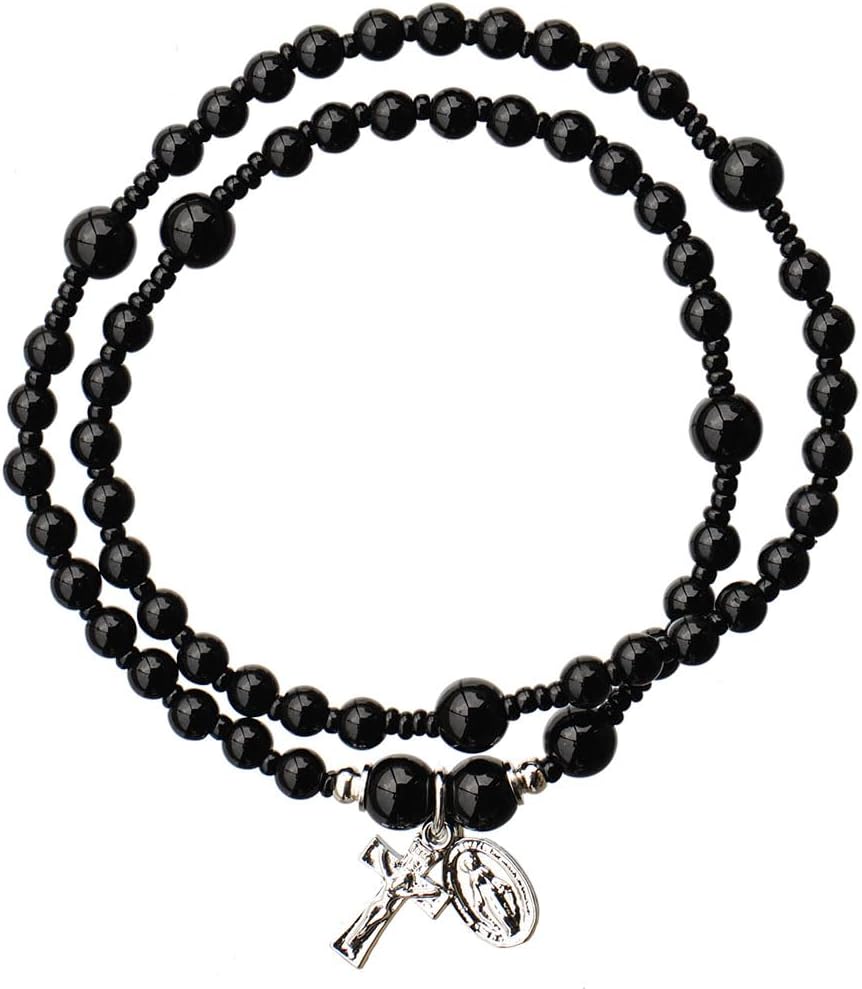 Sine Cera Black Onyx Twisting 5 Decade Catholic Rosary Bracelet with Lusterous Pewter Crucifix and Miraculous Medal, Durable Stretch Design, 4mm Smooth Stone Beads