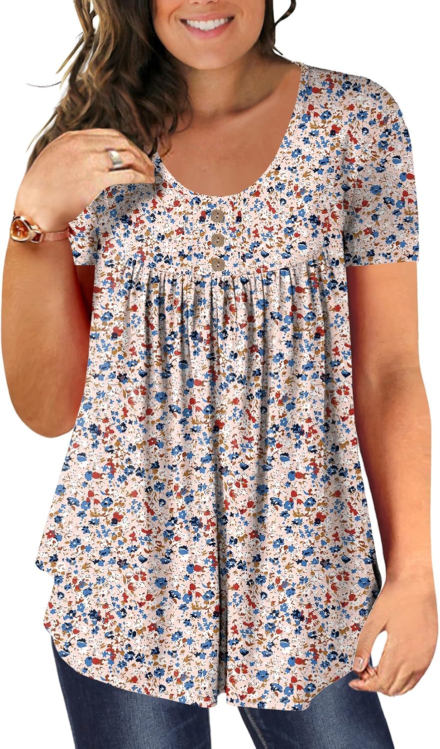 BeadChica Women's Plus Size Tunic Tops Casual Flowy Tshirts Ruched Botton Up Short Sleeve Blouses-Printed-3XL