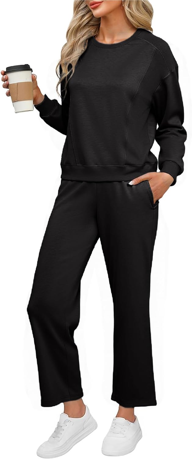 Glamaker Womens Lounge Two Piece Outfits Airport Casual Travel Crew Neck Sets Long Sleeve Tops & Wide Pants 2025 Trendy