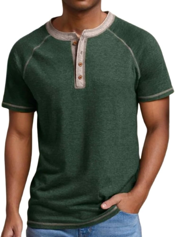 Mens Henley Short Sleeve T-Shirt Casual Shirt Button Color Blocking