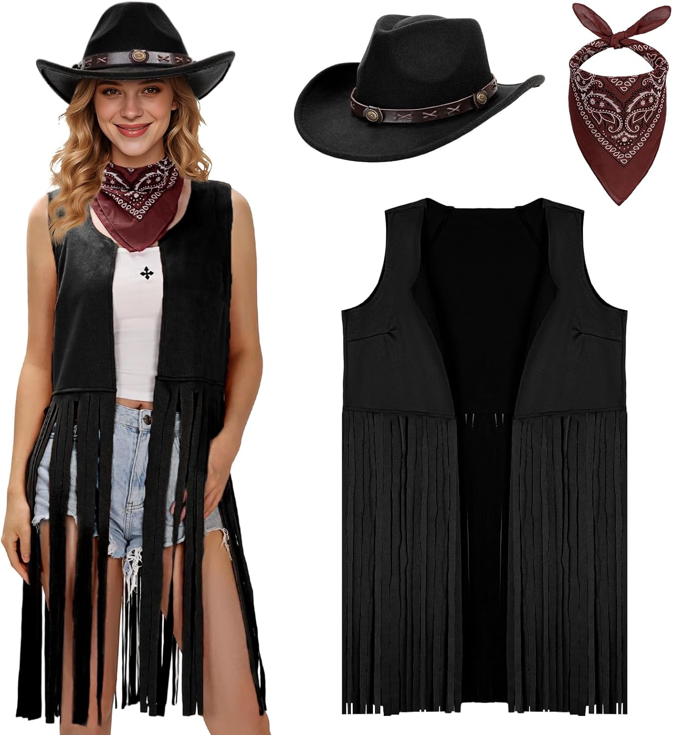 Ultrafun Western Outfit for Women Cowgirl Tassel Sleeveless Vest Cowboy Hat Paisley Bandana Halloween Costumes
