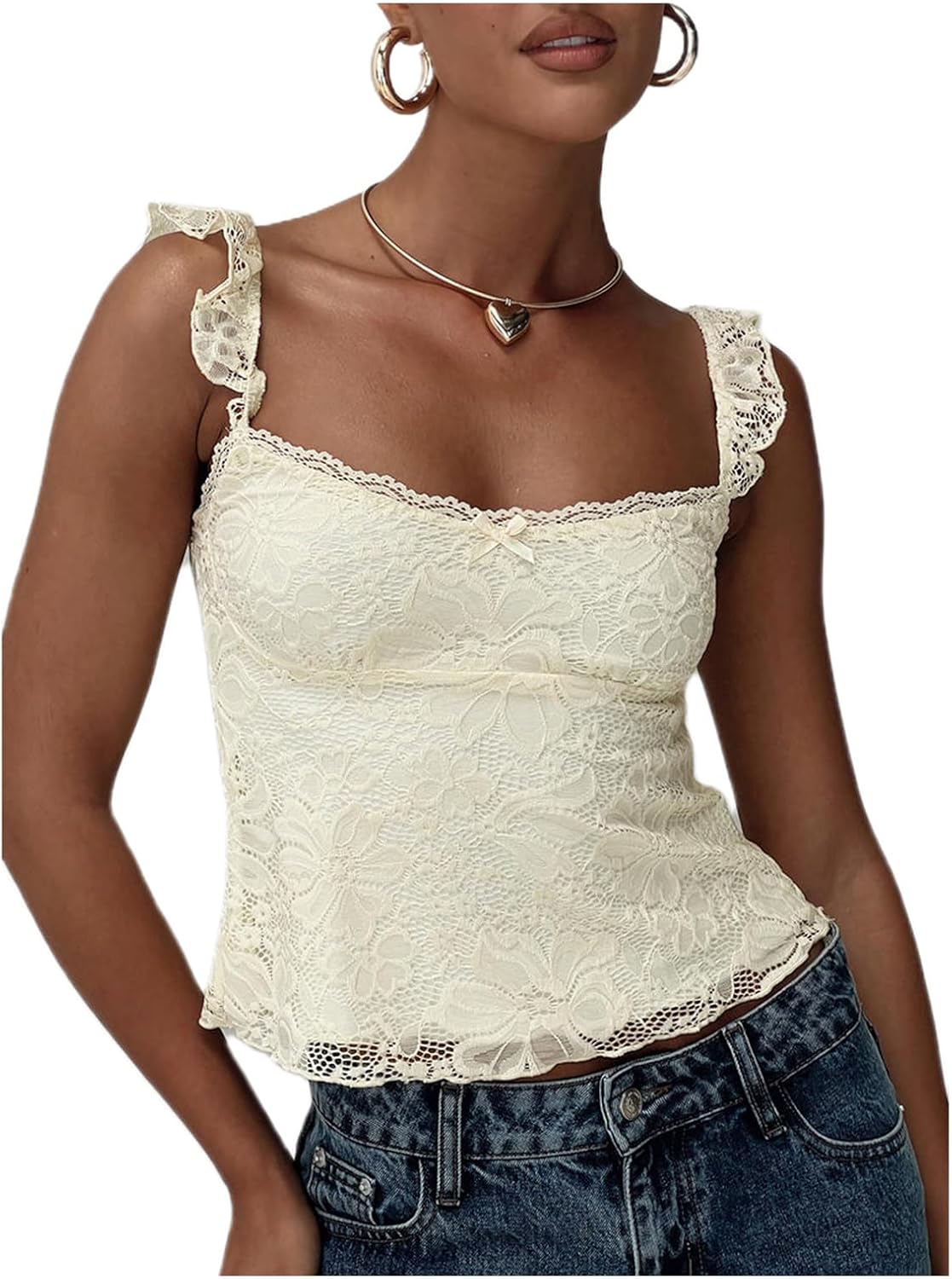 Women Ruffle Lace Tank Top Y2k Slim Fit Floral Lace Cami Top Summer Solid Color Square Neck Sleeveless Cami Shirt