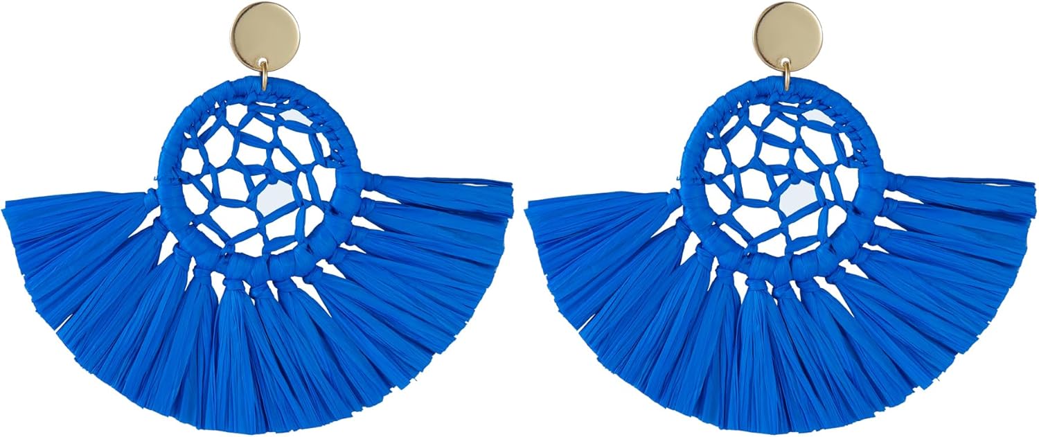 Viva Joya Boho Raffia Summer Beach Earrings for Women, Large Statement Dangle Drop, Lightweight Handmade Woven Fan Tassel Jewelry