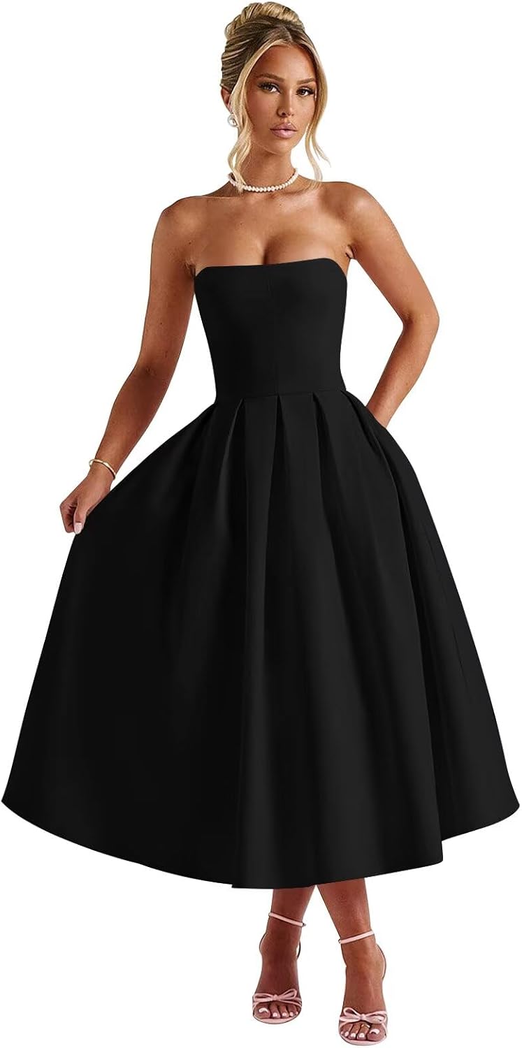 Strapless Satin Tea Length Prom Dresses for Women 2025 A-Line Corset Backless Cocktail Bridesmaid Dress with Pocket