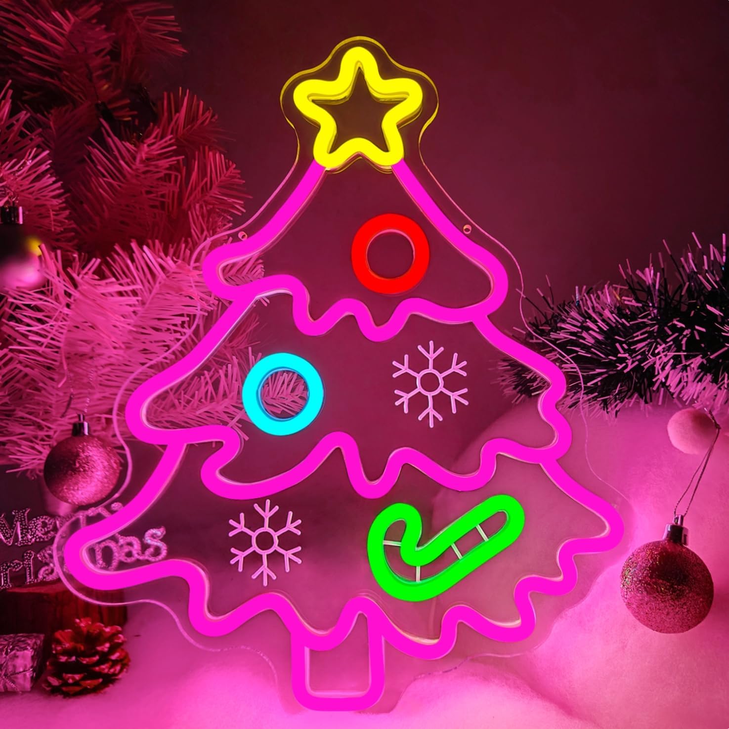 - LIGHT UP THE CHRISTMAS ATMOSPHERE:Pink Christmas tree neon sign easily light up every corner!Xmas tree led sign is not only an ideal Christmas decoration, but also a visual focus that conveys joy and warmth. Whether it is to decorate the home space, create a party atmosphere, or as a gift to relatives and friends, it can ignite the strong festive atmosphere with bright light and shadow