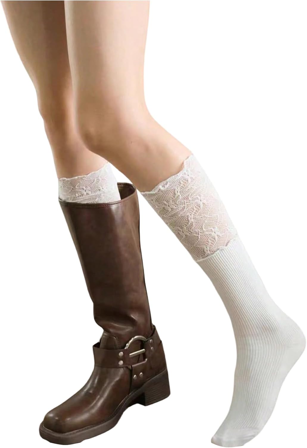 Women's 1 Pair Patchwork Lace Socks Ribbed College Over The Calf Stockings Cute Y2k Boot Socks