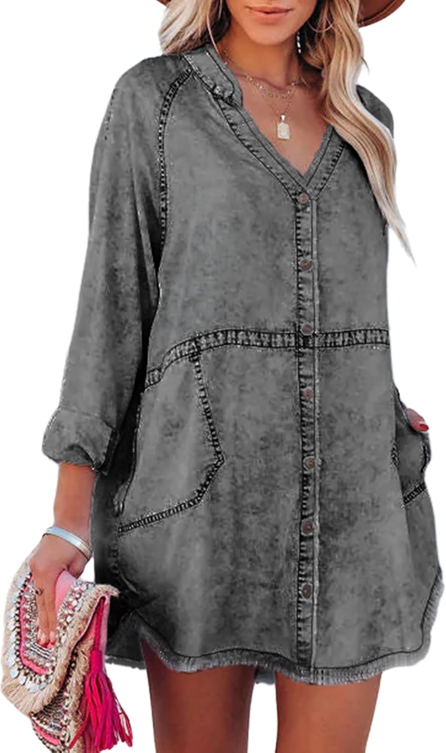 Denim Shirt Dress for Women Long Sleeve Button Down Shirts V Neck Mini Casual Jean Dresses 2026 Trendy Outfits