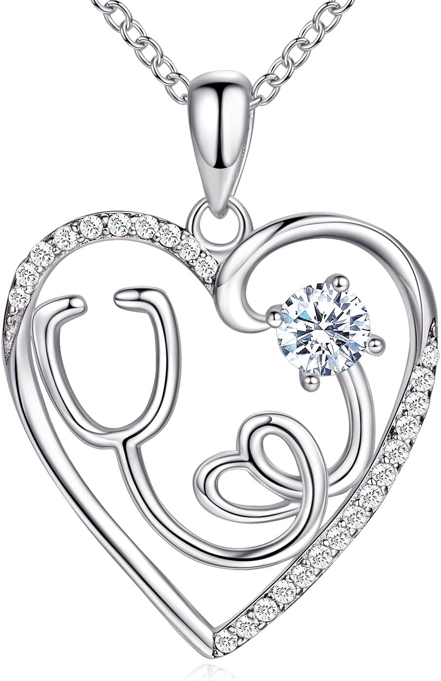AmorAime 925 Sterling Silver Heart Necklace Nurse Birthstone Necklace 14K Gold Plated or Rose Gold Plated Stethoscope Necklaces for Doctor Medical RN for Festival or Holiday