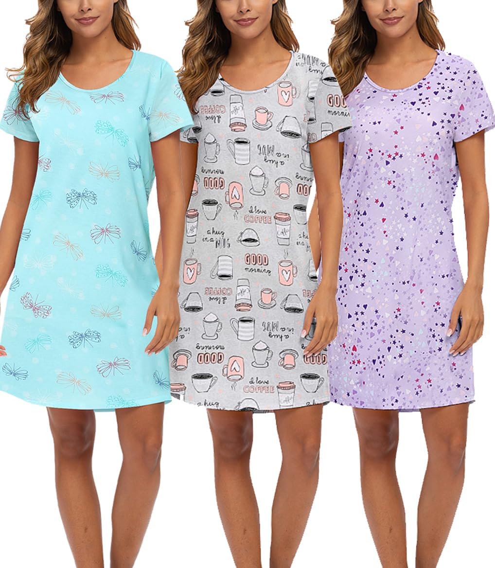 ENJOYNIGHT 3 Pack Womens Nightshirt Cotton Nightgown Short Sleeve Soft Sleep Shirt