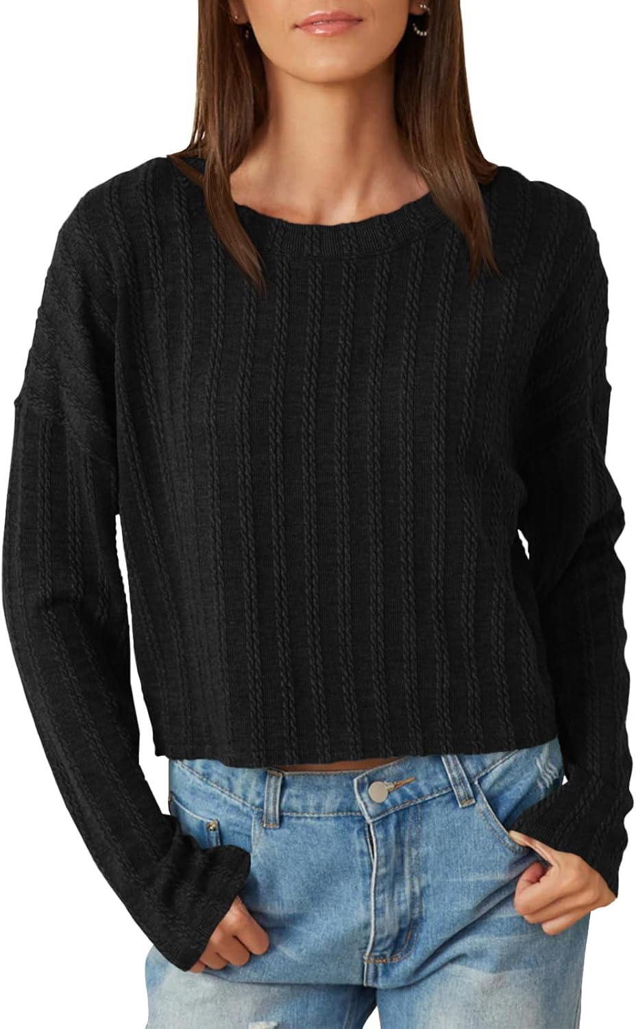 Tankaneo Womens Long Sleeve Crop Tops Textured Loose Fit T-Shirts Crewneck Basic Tees Casual Fall Knitwear