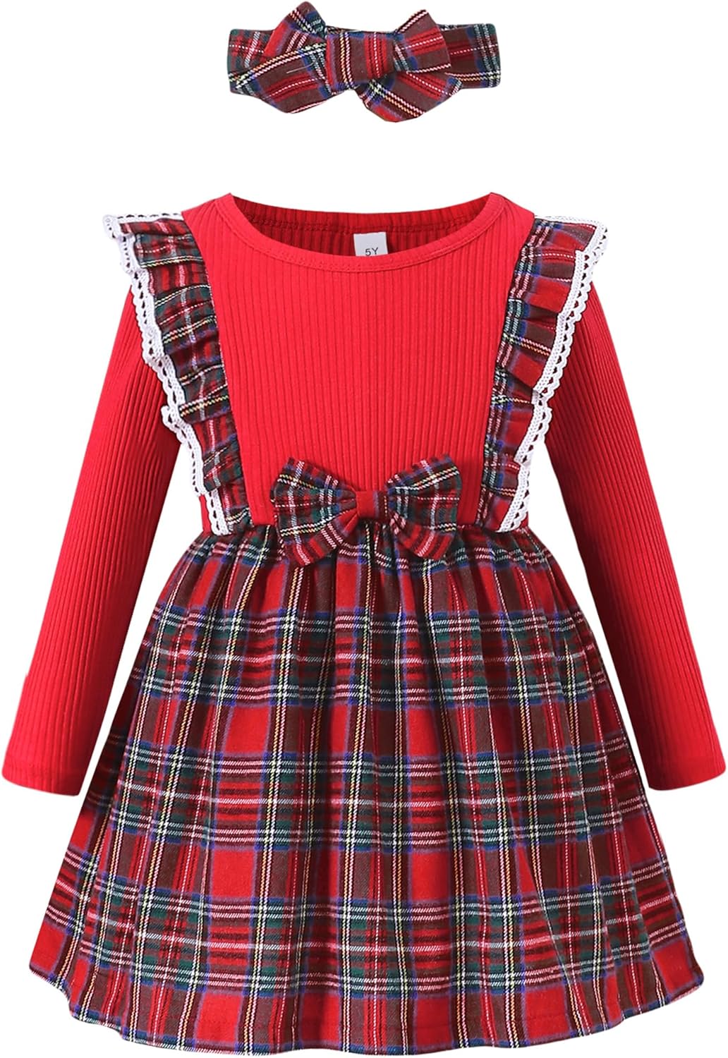 Toddler Girls Dress with Headwear: Cotton Long Sleeve Ruffle Plaid Dresses for Winter Christmas Party Gift 2-8T