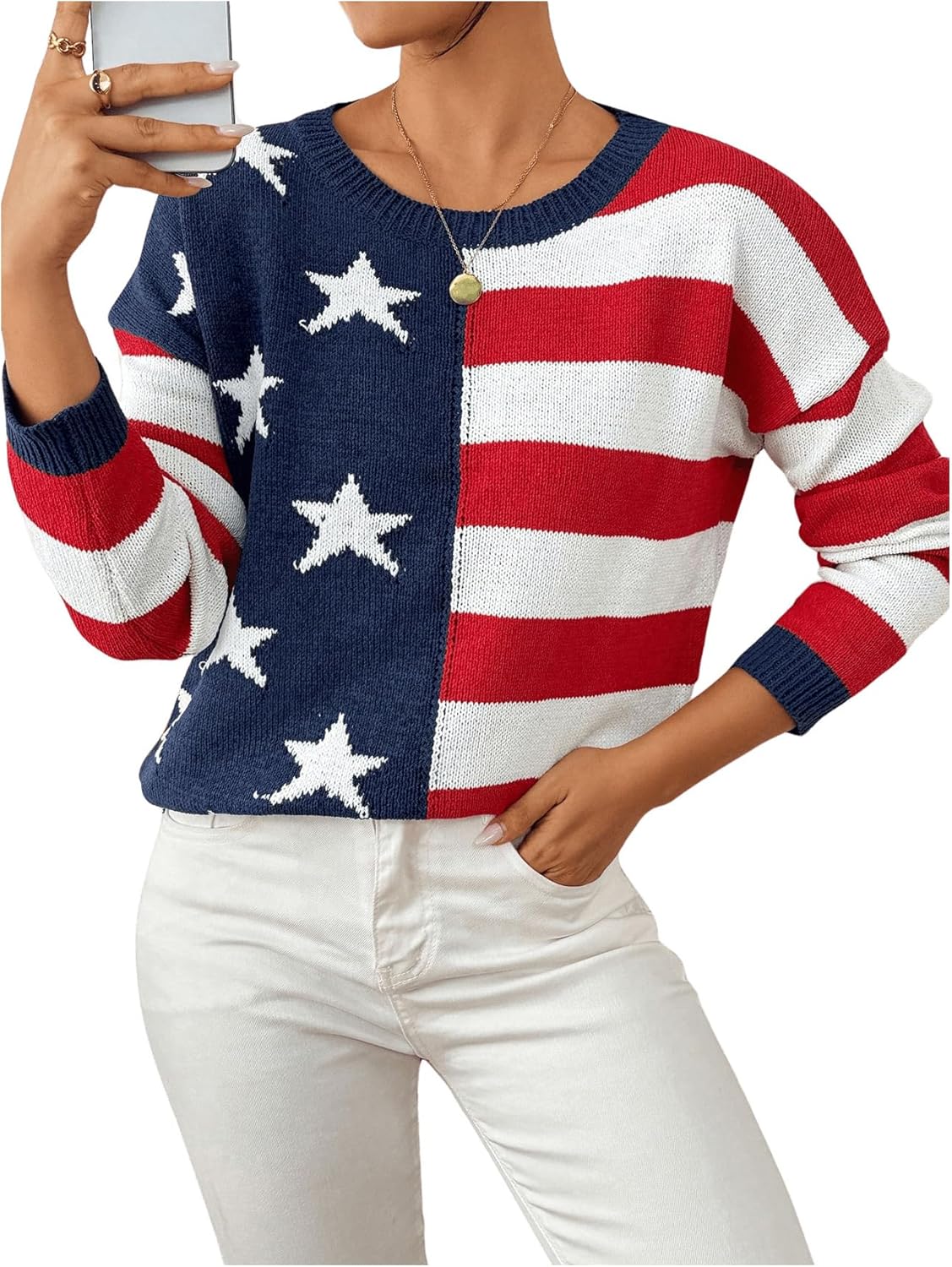 SweatyRocks Women's American Flag Sweater USA Star Striped Knit Sweater Pullover Long Sleeve Top