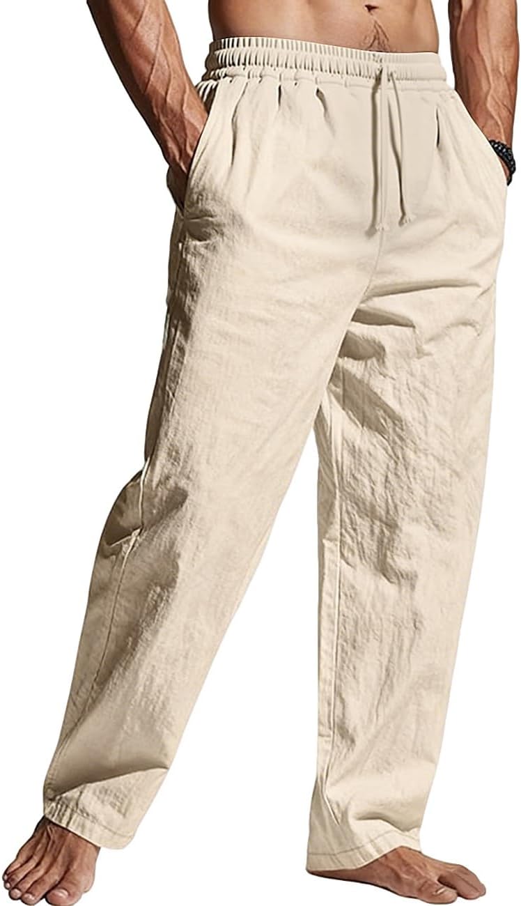 Men's Casual Linen Pants Loose Fit Drawstring Waist Lightweight Men Linen Summer Beach Long Pants Yoga