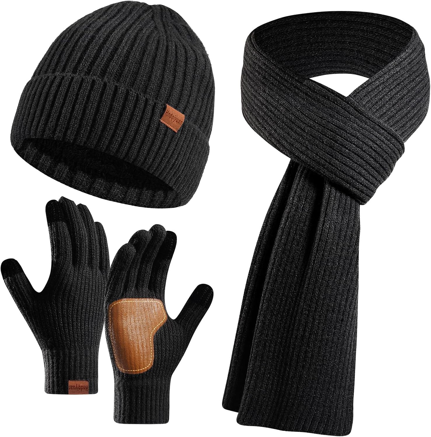3PCS Winter Beanie Hat Scarf Touchscreen Gloves Set for Men & Women, Knitted Fleece Lined Hats Gloves Long Scarf