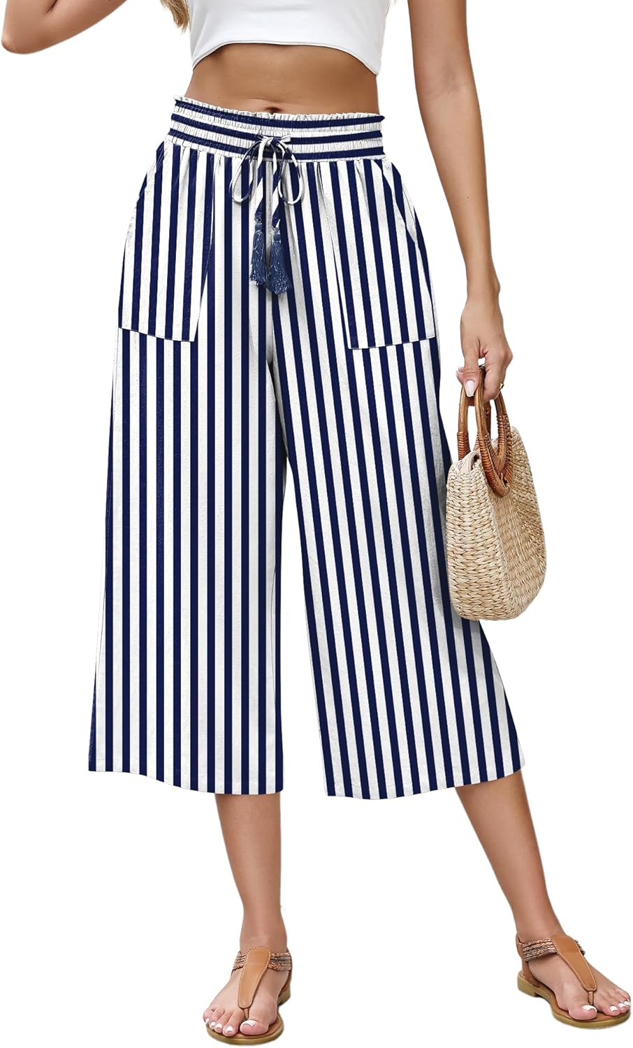 LOMON Women's Linen Capri Pants Wide Leg with Drawstring Elastic Waist Casual Cropped Pant