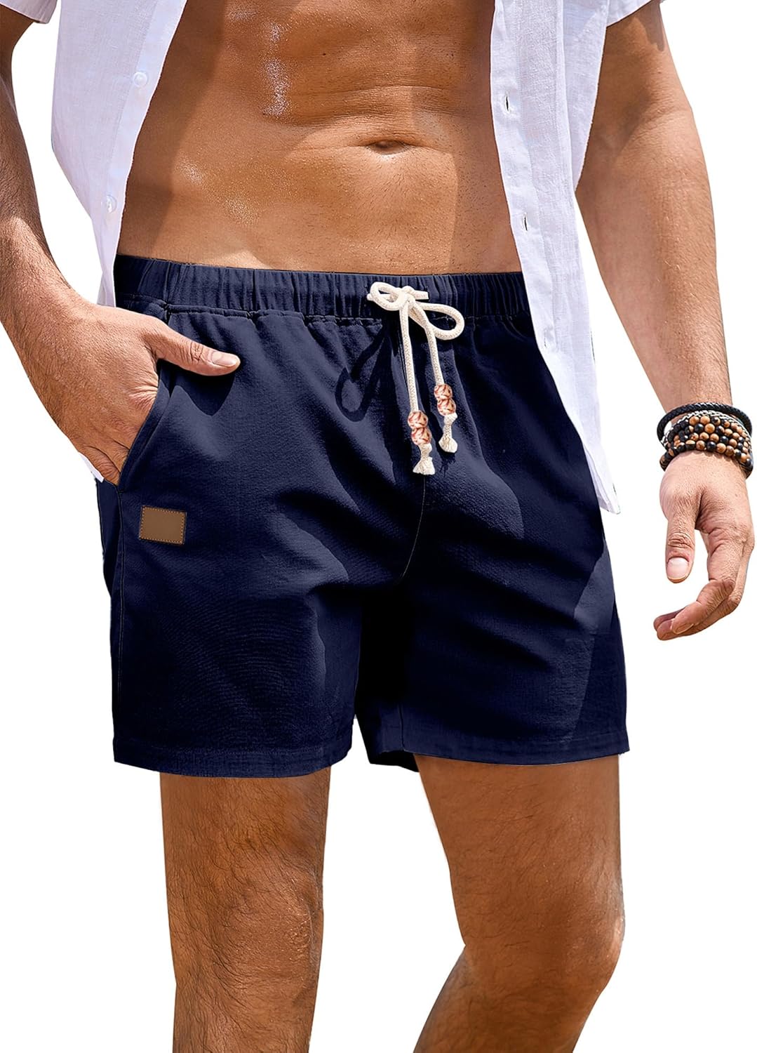 Mens Casual Beach Shorts Elastic Drawstring Waist Cotton Linen Shorts with Pockets