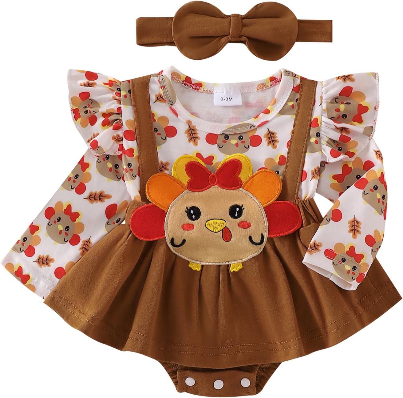 Baby Girl Thanksgiving Romper Dress Cute Turkey Print Long Sleeve Patchwork Jumpsuit+Bow Headband 2pcs Xmas Set