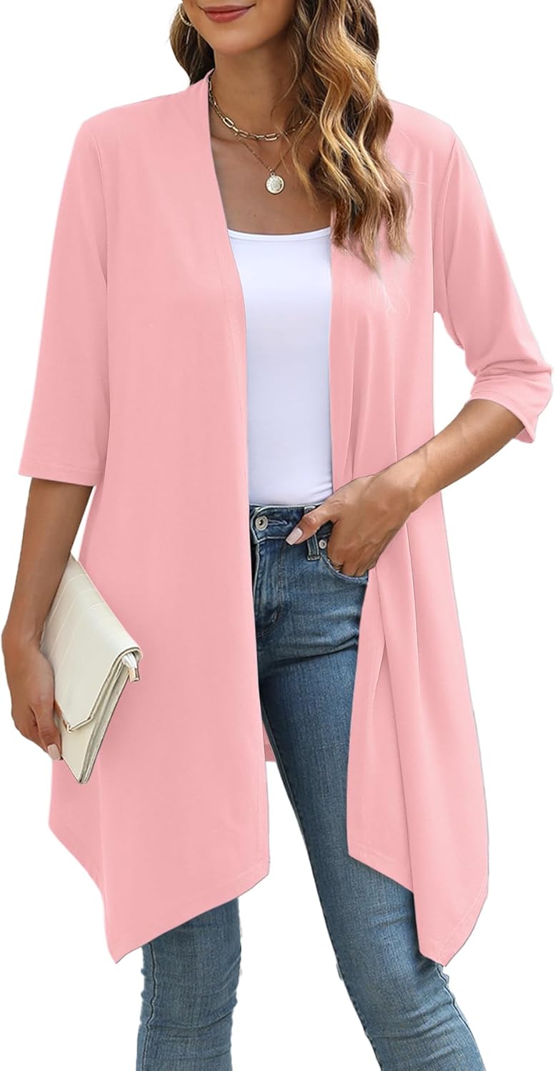 Women's Open Front Cardigan Lightweight Soft Knit 3/4 Sleeve High-Low Draped Hem Loose Casual Duster