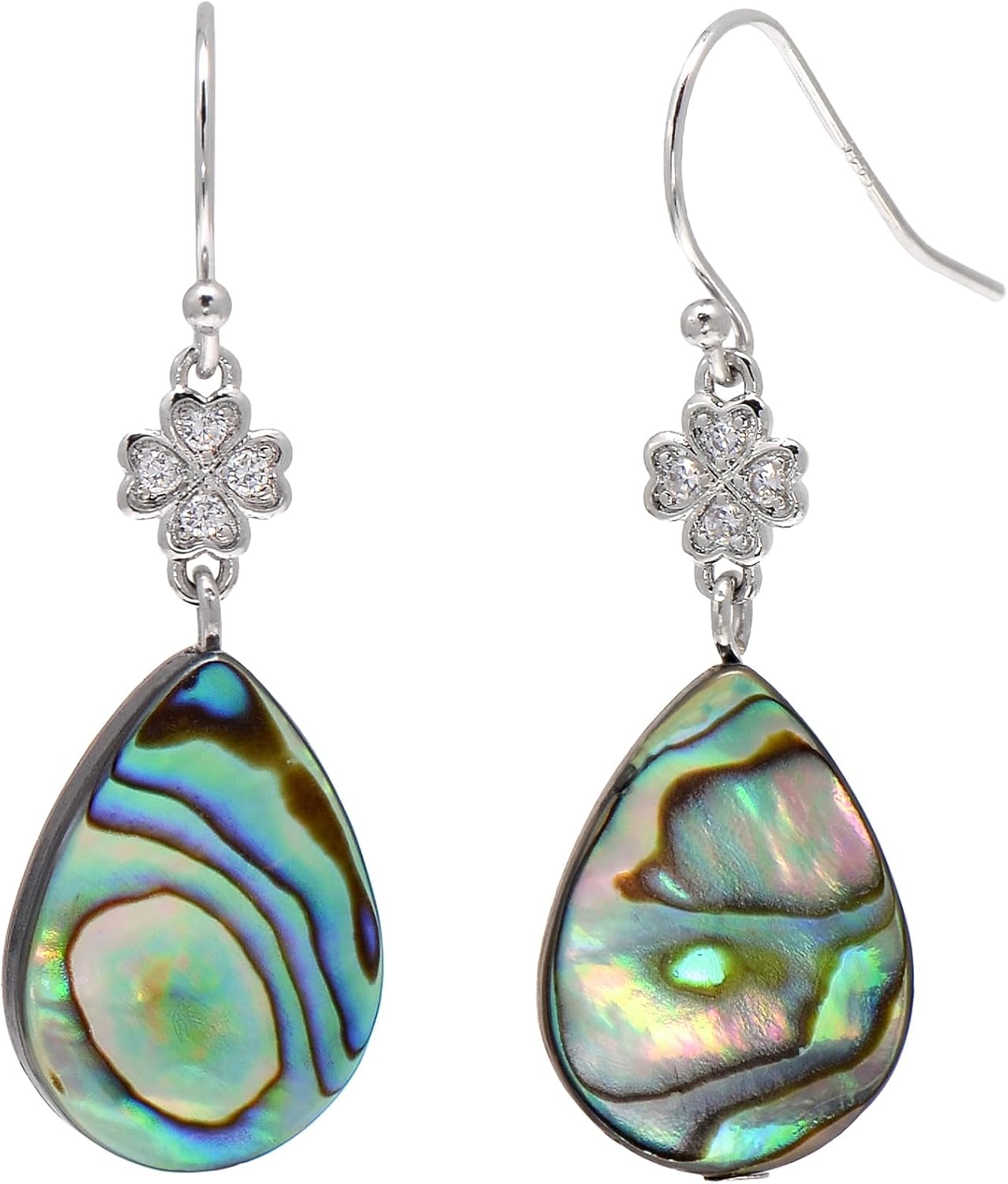 Joseph Brothers Teardrop Abalone Shell Four Leaf Clover Earrings for Women, Sterling Silver Hooks